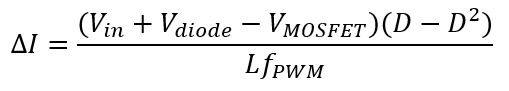 我將跳過一些數(shù)學運算,直接獲得重要結(jié)果。首先,電感和PWM頻率與紋波電壓成反比。其次,紋波也是PWM占空比的二次函數(shù)。降壓轉(zhuǎn)換器中的紋波電流為: