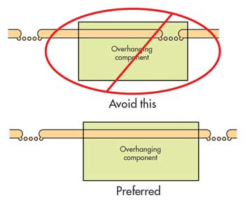 要清除圓形切割刀片,必須保持0.05英寸。從組件到V型槽刻痕中心的間隙,要考慮到組件的尺寸和安裝變化。由于位置的變化,諸如徑向電容器,徑向電感器和耗能徑向陶瓷電阻器之類的高大部件之間的間距必須大于0.05英寸(標稱值),而連接器和其他矮型零件的間距應為0.05英寸。 -在。清除。如果與刻痕線之間的距離小于0.25英寸(6.35毫米),則表面安裝的多層陶瓷片式電容器(MLCC)的長邊必須平行于V形槽切口,并且無論距離刻線應保持0.119英寸(3毫米)。 。對于較大尺寸的蓋子和某些蓋子電介質(zhì),這變得尤為重要。由于迫使分裝板刀片進入V形槽而產(chǎn)生的表面應力會通過板表面?zhèn)鬟f到剛性焊點,然后傳遞到組件主體。如果它們太靠近V形槽,則可能使它們斷裂。將電容器本體的長邊緣平行于邊緣定位可使本體斷裂的風險降到很低(再次參見圖2)。