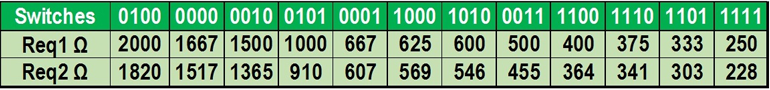 對(duì)于BANK2 : 對(duì)于R1 = R2 = R4 = R5 = 910Ω,且R 3 = 1100Ω,對(duì)于1100的第一組合 à 364Ω 和1001交替組合 à 371Ω; 為1101的第一組合 à 303.3Ω和1011交替組合 à 321.9Ω。