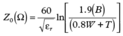 H是從地平面到信號(hào)線的距離,W是線寬度,T是線厚度;所有尺寸單位為mils。εr是PCB材料的介電常數(shù)。