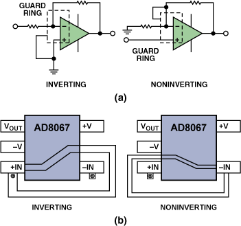 保護(hù)環(huán),或稱“保護(hù)”,是與運(yùn)放一起使用的另一種常見(jiàn)的屏蔽類型;它用于防止雜散電流進(jìn)入敏感節(jié)點(diǎn)。其原理很簡(jiǎn)單,就是用保護(hù)導(dǎo)體完全包圍敏感節(jié)點(diǎn),保護(hù)導(dǎo)體與敏感節(jié)點(diǎn)保持在或驅(qū)動(dòng)到(低阻抗)相同的電位,從而從敏感節(jié)點(diǎn)吸收雜散電流。圖15(a)顯示了反向和非反向運(yùn)算放大器配置的保護(hù)環(huán)示意圖。圖15(b)顯示了SOT-23-5包的兩個(gè)保護(hù)環(huán)的典型實(shí)現(xiàn)。